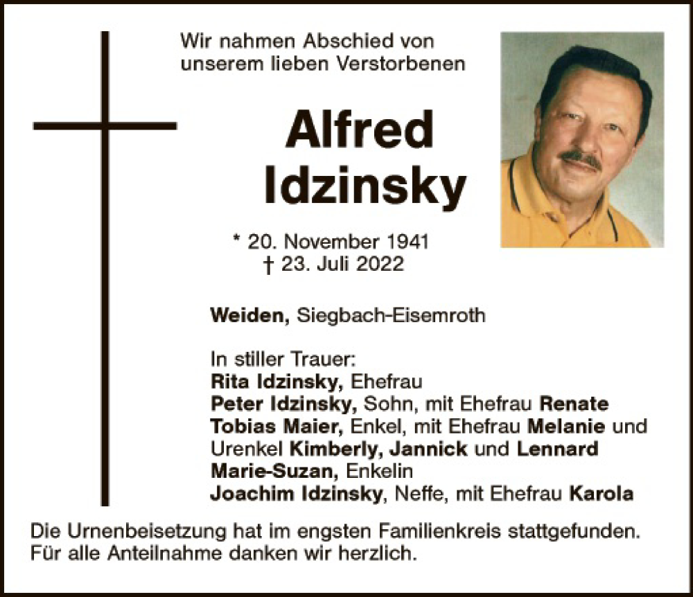 Hier finden Sie alle Traueranzeigen aus der Zeitung, die bisher für Alfred Idzinsky erschienen sind. Weitere Traueranzeigen, die in der Zeitung erscheinen, werden hier ebenfalls aufgelistet