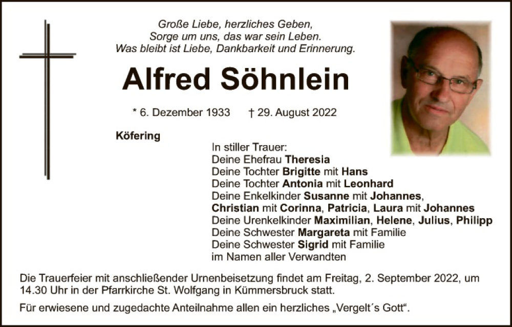 Hier finden Sie alle Traueranzeigen aus der Zeitung, die bisher für Alfred Söhnlein erschienen sind. Weitere Traueranzeigen, die in der Zeitung erscheinen, werden hier ebenfalls aufgelistet