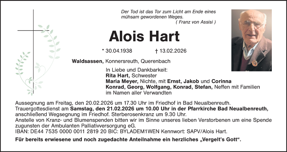Hier finden Sie alle Traueranzeigen aus der Zeitung, die bisher für Alois Hart erschienen sind. Weitere Traueranzeigen, die in der Zeitung erscheinen, werden hier ebenfalls aufgelistet