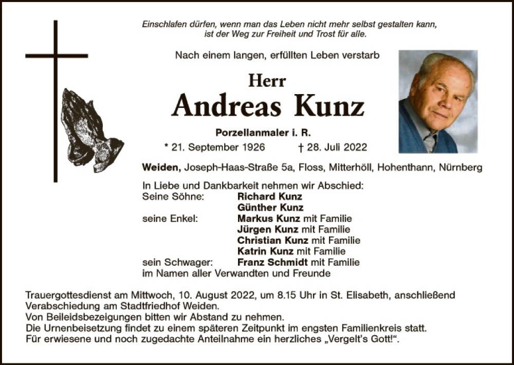 Hier finden Sie alle Traueranzeigen aus der Zeitung, die bisher für Andreas Kunz erschienen sind. Weitere Traueranzeigen, die in der Zeitung erscheinen, werden hier ebenfalls aufgelistet