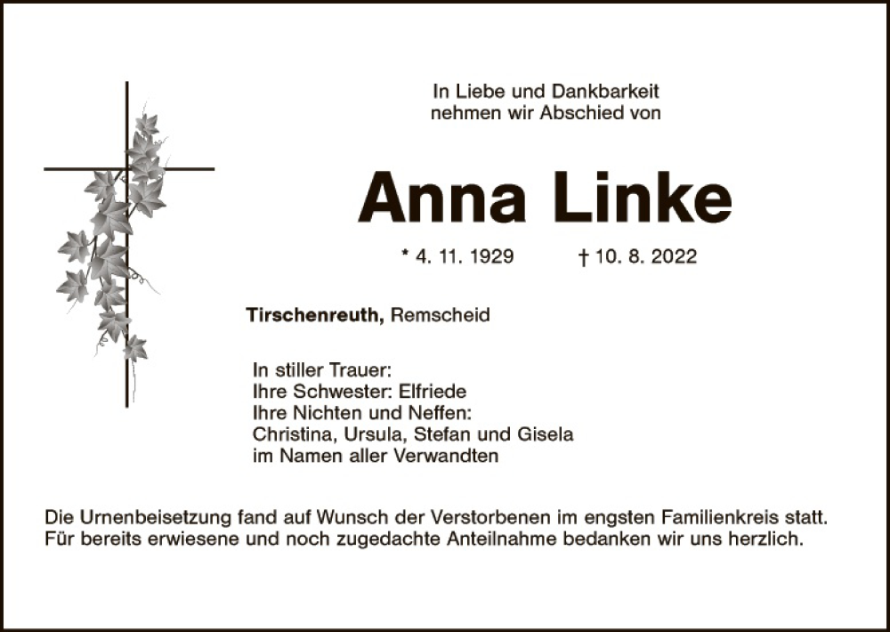Hier finden Sie alle Traueranzeigen aus der Zeitung, die bisher für Anna Linke erschienen sind. Weitere Traueranzeigen, die in der Zeitung erscheinen, werden hier ebenfalls aufgelistet