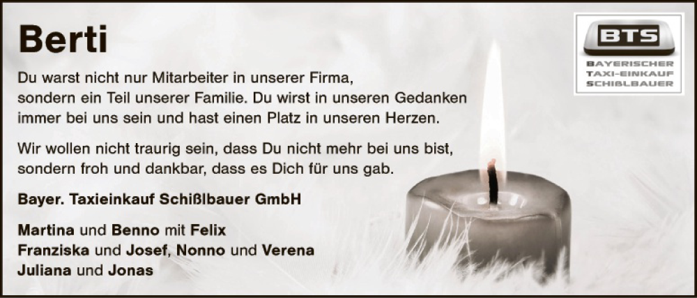 Hier finden Sie alle Traueranzeigen aus der Zeitung, die bisher für Berti erschienen sind. Weitere Traueranzeigen, die in der Zeitung erscheinen, werden hier ebenfalls aufgelistet