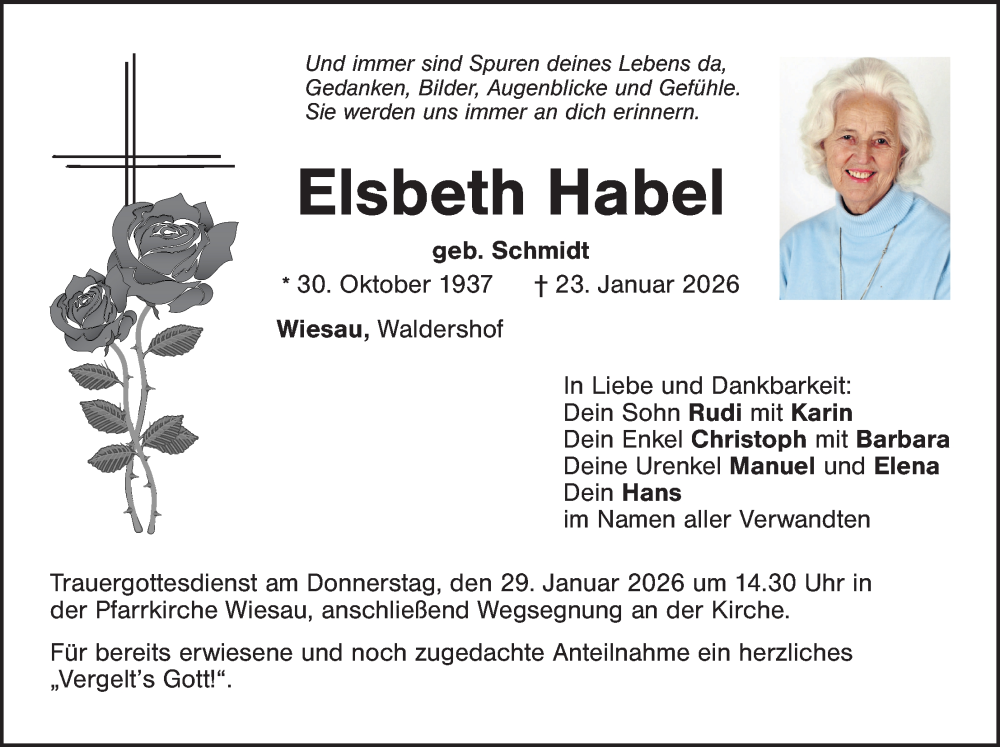Hier finden Sie alle Traueranzeigen aus der Zeitung, die bisher für Elsbeth Habel erschienen sind. Weitere Traueranzeigen, die in der Zeitung erscheinen, werden hier ebenfalls aufgelistet