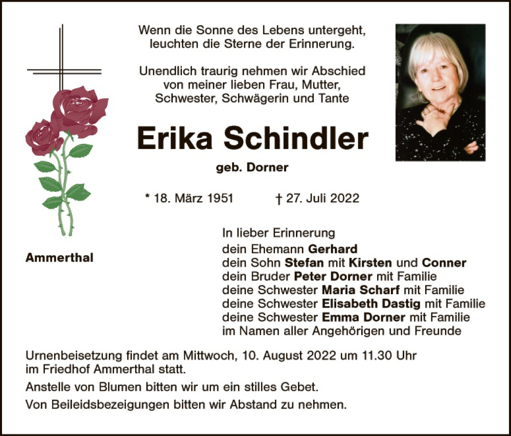 Hier finden Sie alle Traueranzeigen aus der Zeitung, die bisher für Erika Schindler erschienen sind. Weitere Traueranzeigen, die in der Zeitung erscheinen, werden hier ebenfalls aufgelistet