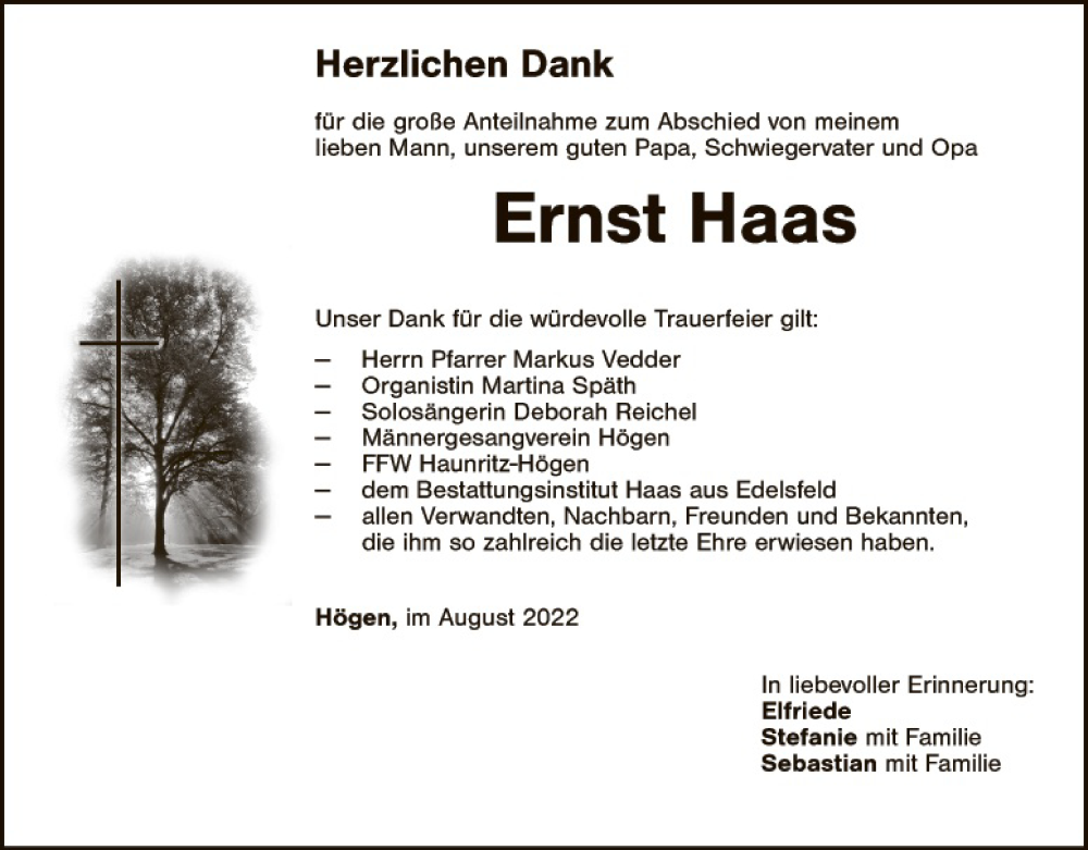 Hier finden Sie alle Traueranzeigen aus der Zeitung, die bisher für Ernst Haas erschienen sind. Weitere Traueranzeigen, die in der Zeitung erscheinen, werden hier ebenfalls aufgelistet