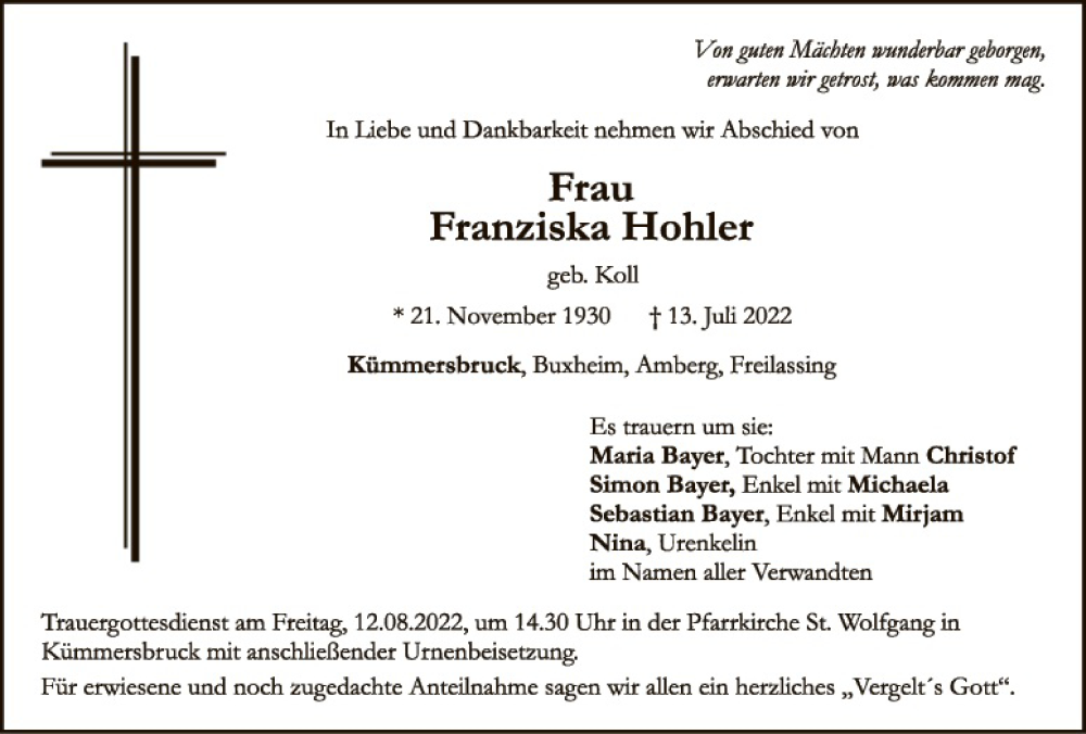 Hier finden Sie alle Traueranzeigen aus der Zeitung, die bisher für Franziska Hohler erschienen sind. Weitere Traueranzeigen, die in der Zeitung erscheinen, werden hier ebenfalls aufgelistet