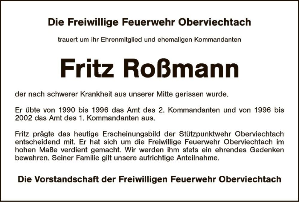 Hier finden Sie alle Traueranzeigen aus der Zeitung, die bisher für Fritz Roßmann erschienen sind. Weitere Traueranzeigen, die in der Zeitung erscheinen, werden hier ebenfalls aufgelistet