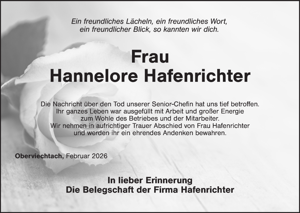 Hier finden Sie alle Traueranzeigen aus der Zeitung, die bisher für Hannelore Hafenrichter erschienen sind. Weitere Traueranzeigen, die in der Zeitung erscheinen, werden hier ebenfalls aufgelistet