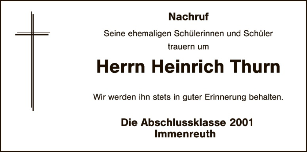 Hier finden Sie alle Traueranzeigen aus der Zeitung, die bisher für Heinrich Thurn erschienen sind. Weitere Traueranzeigen, die in der Zeitung erscheinen, werden hier ebenfalls aufgelistet