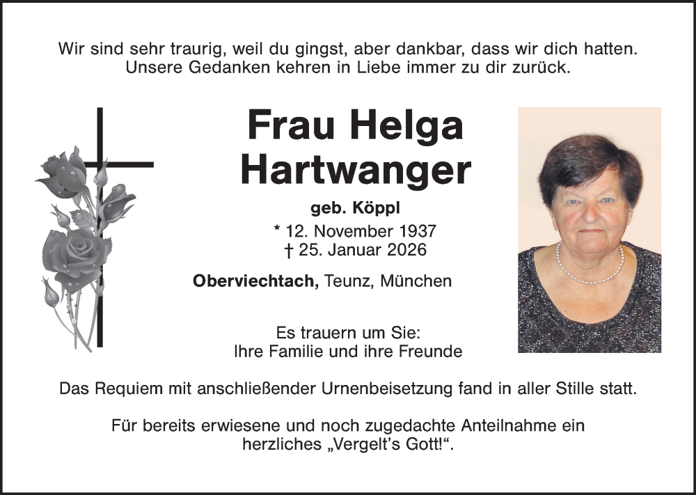 Hier finden Sie alle Traueranzeigen aus der Zeitung, die bisher für Helga Hartwanger erschienen sind. Weitere Traueranzeigen, die in der Zeitung erscheinen, werden hier ebenfalls aufgelistet