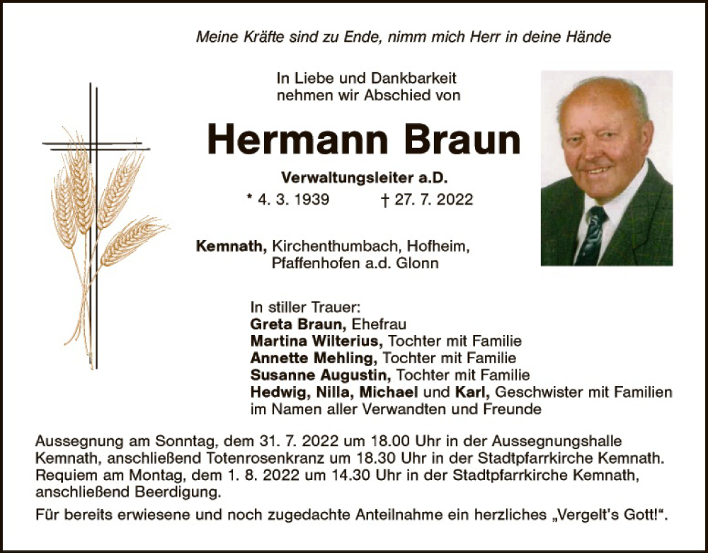 Hier finden Sie alle Traueranzeigen aus der Zeitung, die bisher für Hermann Braun erschienen sind. Weitere Traueranzeigen, die in der Zeitung erscheinen, werden hier ebenfalls aufgelistet