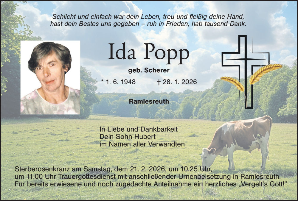 Hier finden Sie alle Traueranzeigen aus der Zeitung, die bisher für Ida Popp erschienen sind. Weitere Traueranzeigen, die in der Zeitung erscheinen, werden hier ebenfalls aufgelistet
