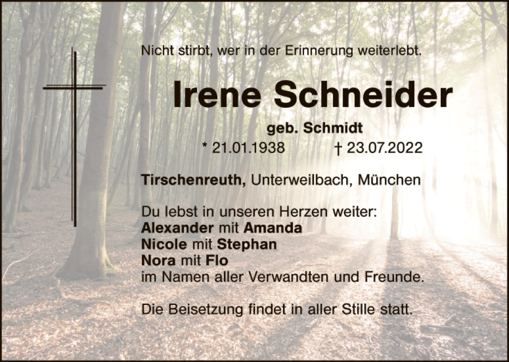Hier finden Sie alle Traueranzeigen aus der Zeitung, die bisher für Irene Schneider erschienen sind. Weitere Traueranzeigen, die in der Zeitung erscheinen, werden hier ebenfalls aufgelistet