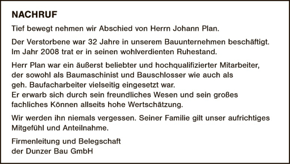 Hier finden Sie alle Traueranzeigen aus der Zeitung, die bisher für Johann Plan erschienen sind. Weitere Traueranzeigen, die in der Zeitung erscheinen, werden hier ebenfalls aufgelistet