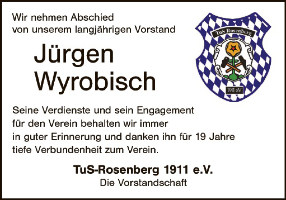 Hier finden Sie alle Traueranzeigen aus der Zeitung, die bisher für Jürgen Wyrobisch erschienen sind. Weitere Traueranzeigen, die in der Zeitung erscheinen, werden hier ebenfalls aufgelistet