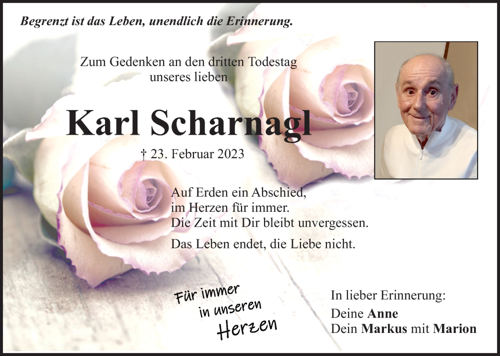 Hier finden Sie alle Traueranzeigen aus der Zeitung, die bisher für Karl Scharnagl erschienen sind. Weitere Traueranzeigen, die in der Zeitung erscheinen, werden hier ebenfalls aufgelistet