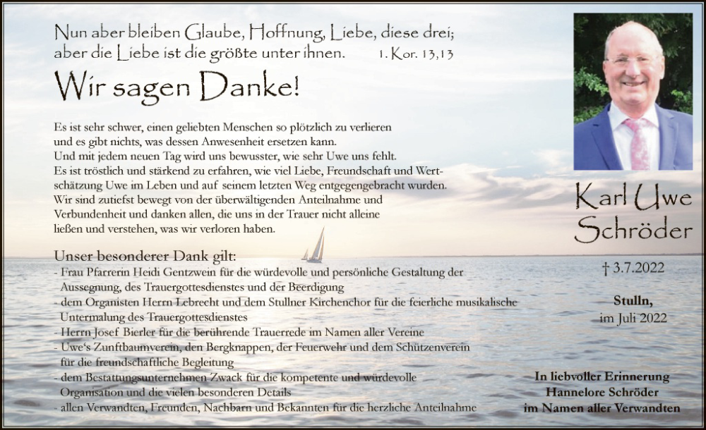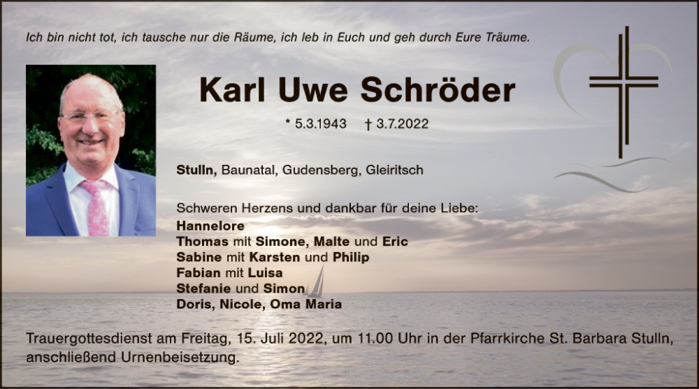 Hier finden Sie alle Traueranzeigen aus der Zeitung, die bisher für Karl Uwe Schröder erschienen sind. Weitere Traueranzeigen, die in der Zeitung erscheinen, werden hier ebenfalls aufgelistet