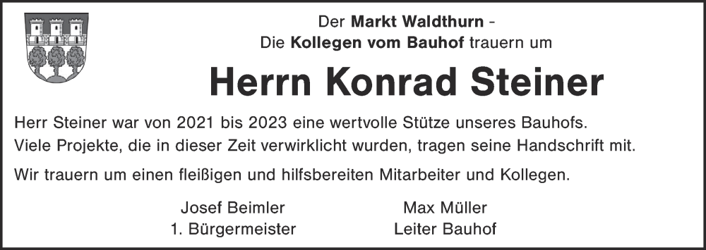 Hier finden Sie alle Traueranzeigen aus der Zeitung, die bisher für Konrad Steiner erschienen sind. Weitere Traueranzeigen, die in der Zeitung erscheinen, werden hier ebenfalls aufgelistet