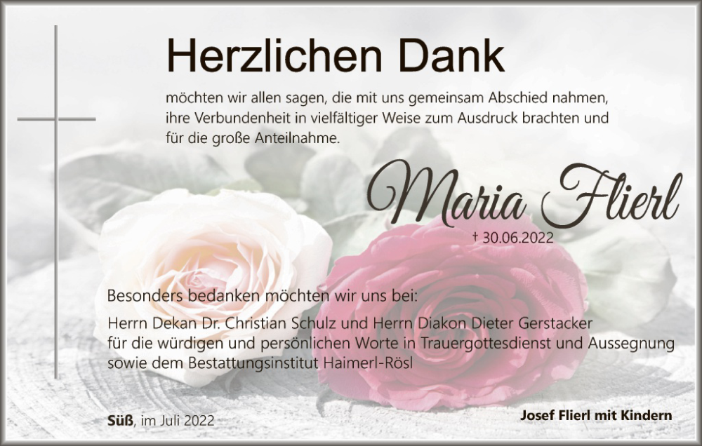 Hier finden Sie alle Traueranzeigen aus der Zeitung, die bisher für Maria Flierl erschienen sind. Weitere Traueranzeigen, die in der Zeitung erscheinen, werden hier ebenfalls aufgelistet