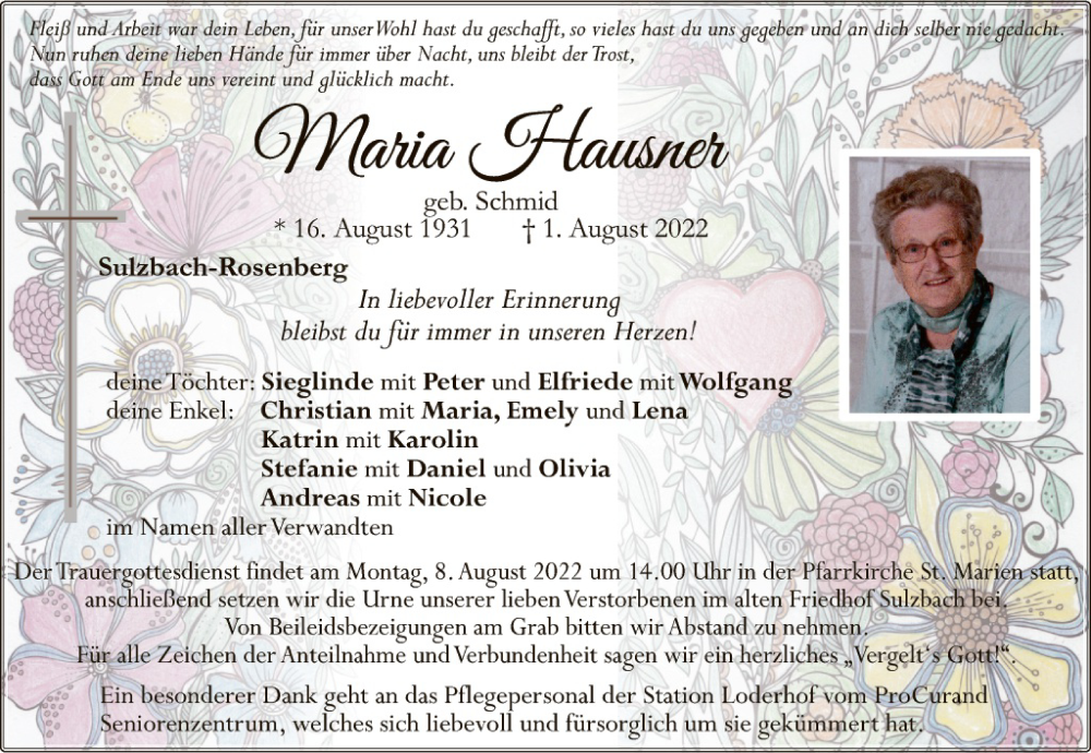 Hier finden Sie alle Traueranzeigen aus der Zeitung, die bisher für Maria Hausner erschienen sind. Weitere Traueranzeigen, die in der Zeitung erscheinen, werden hier ebenfalls aufgelistet