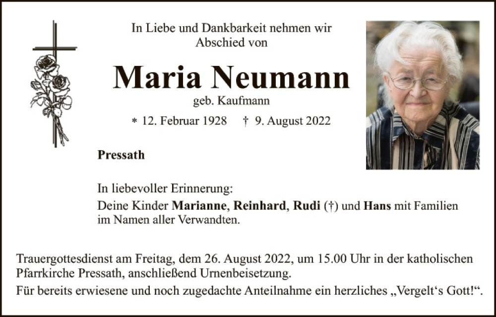Hier finden Sie alle Traueranzeigen aus der Zeitung, die bisher für Maria Neumann erschienen sind. Weitere Traueranzeigen, die in der Zeitung erscheinen, werden hier ebenfalls aufgelistet