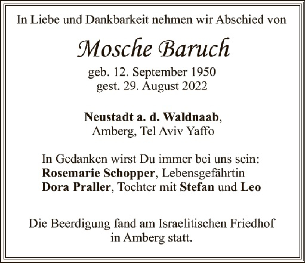 Hier finden Sie alle Traueranzeigen aus der Zeitung, die bisher für Mosche Baruch erschienen sind. Weitere Traueranzeigen, die in der Zeitung erscheinen, werden hier ebenfalls aufgelistet