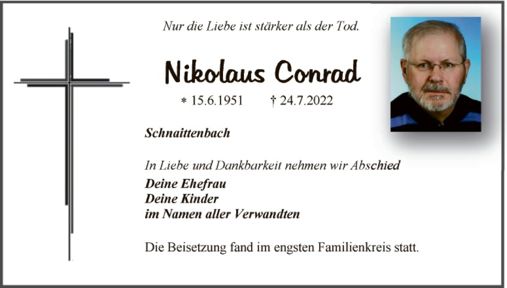 Hier finden Sie alle Traueranzeigen aus der Zeitung, die bisher für Nikolaus Conrad erschienen sind. Weitere Traueranzeigen, die in der Zeitung erscheinen, werden hier ebenfalls aufgelistet