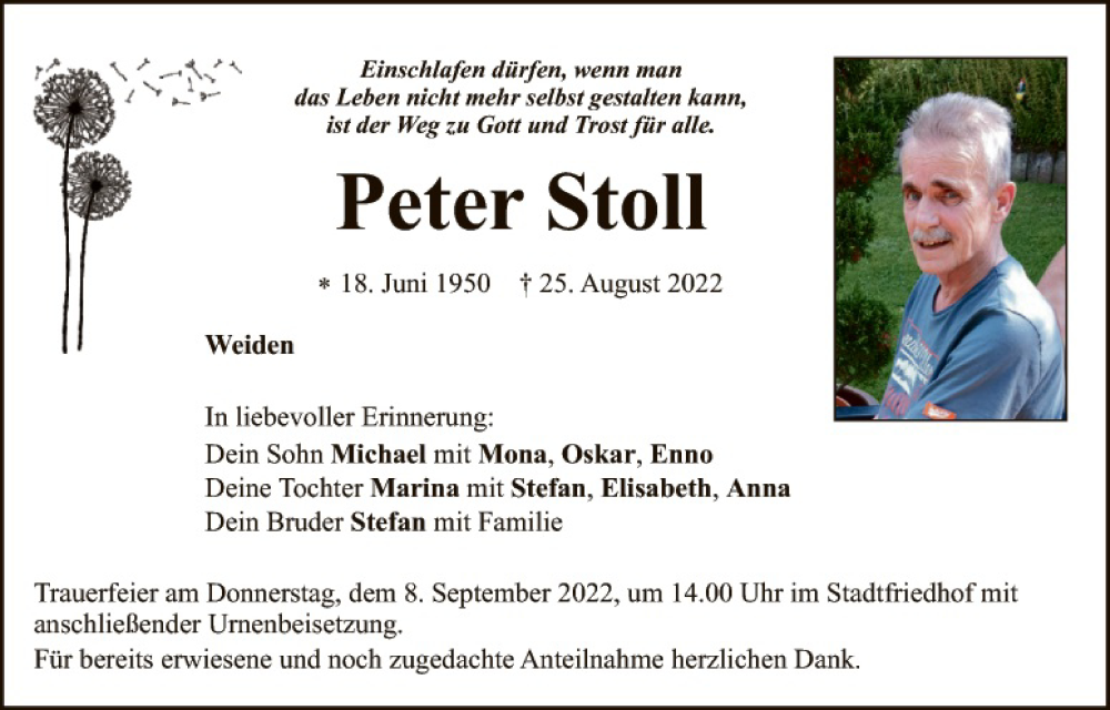 Hier finden Sie alle Traueranzeigen aus der Zeitung, die bisher für Peter Stoll erschienen sind. Weitere Traueranzeigen, die in der Zeitung erscheinen, werden hier ebenfalls aufgelistet