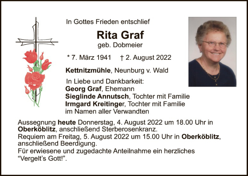 Hier finden Sie alle Traueranzeigen aus der Zeitung, die bisher für Rita Graf erschienen sind. Weitere Traueranzeigen, die in der Zeitung erscheinen, werden hier ebenfalls aufgelistet