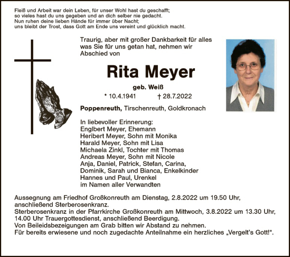 Hier finden Sie alle Traueranzeigen aus der Zeitung, die bisher für Rita Meyer erschienen sind. Weitere Traueranzeigen, die in der Zeitung erscheinen, werden hier ebenfalls aufgelistet