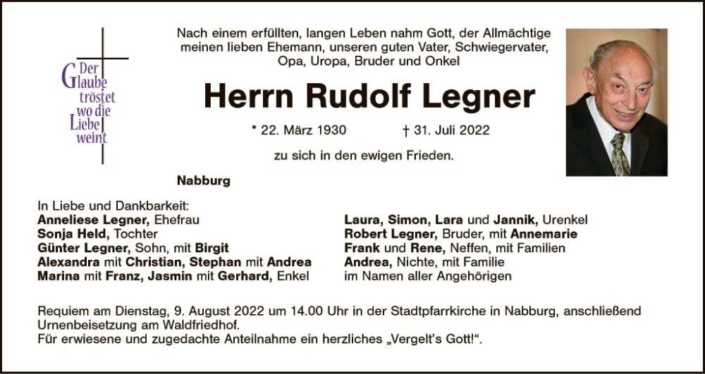 Hier finden Sie alle Traueranzeigen aus der Zeitung, die bisher für Rudolf Legner erschienen sind. Weitere Traueranzeigen, die in der Zeitung erscheinen, werden hier ebenfalls aufgelistet