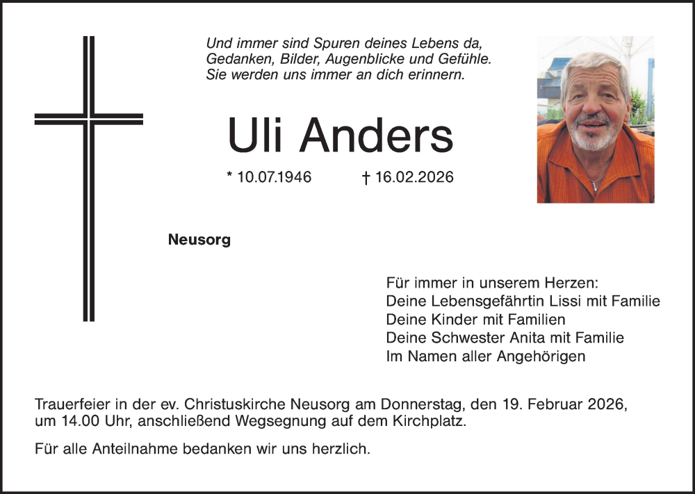 Hier finden Sie alle Traueranzeigen aus der Zeitung, die bisher für Uli Anders erschienen sind. Weitere Traueranzeigen, die in der Zeitung erscheinen, werden hier ebenfalls aufgelistet