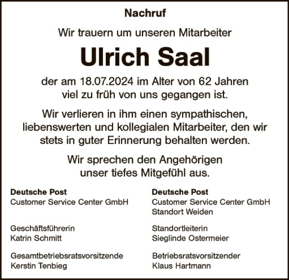 Hier finden Sie alle Traueranzeigen aus der Zeitung, die bisher für Ulrich Saal erschienen sind. Weitere Traueranzeigen, die in der Zeitung erscheinen, werden hier ebenfalls aufgelistet